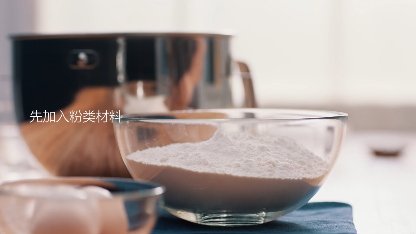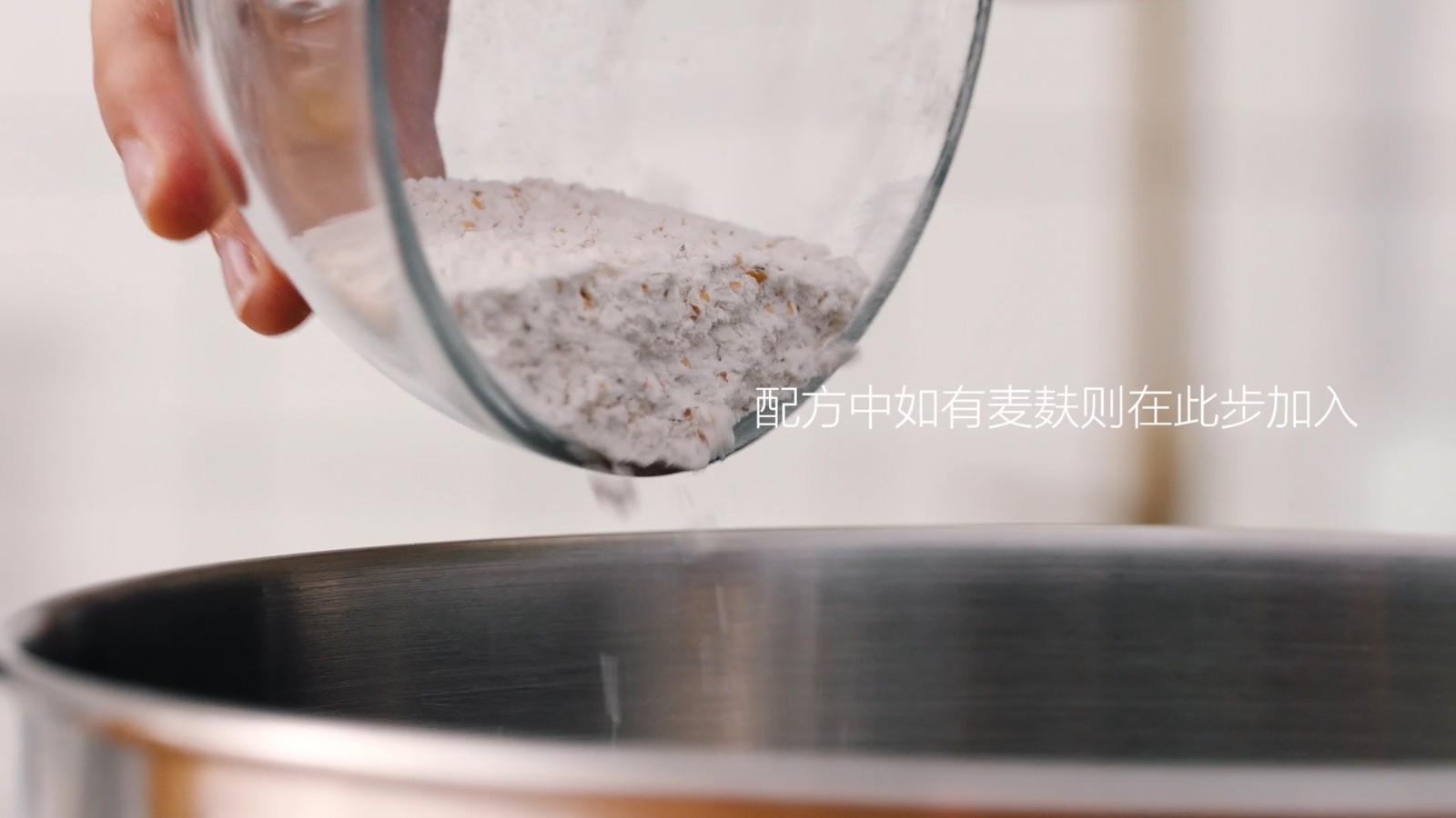 厨师机加料的原则是粉类一起放、液体一起放;可以先加入并混合好粉类再加入液体,也可以加入全部液体后再混入粉类;辅料如蔓越莓干、葡萄干等是最后阶段放入。