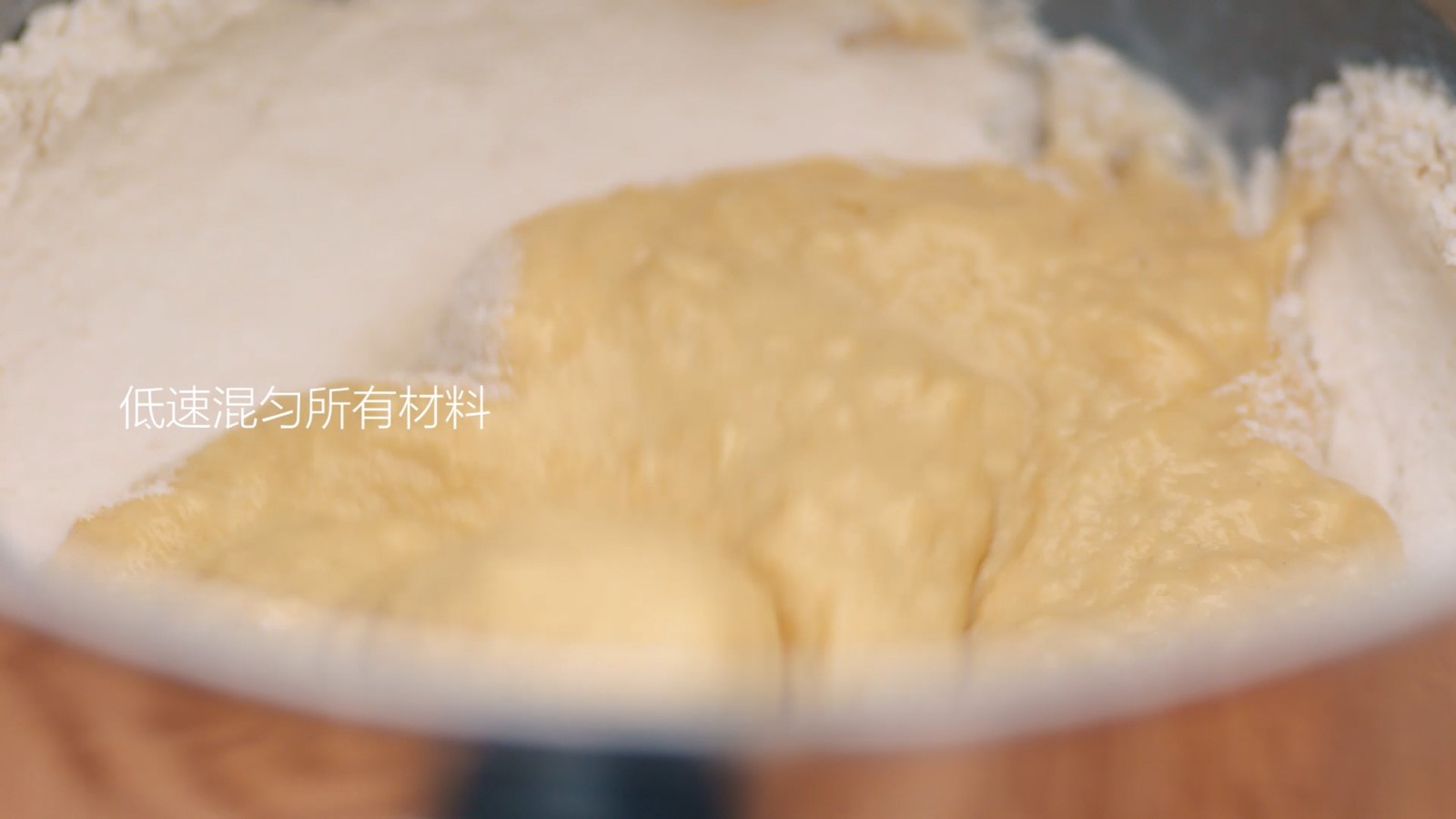 首先以低档将所有的材料混合成一个面团,再以中档-中高档这个速度搅打面团,帮助面团形成面筋,通过搅拌头循环往复的不断搅打,让面筋重复的断裂-胶连的过程,直到形成一个光滑面团,这就是大家常说的出膜。