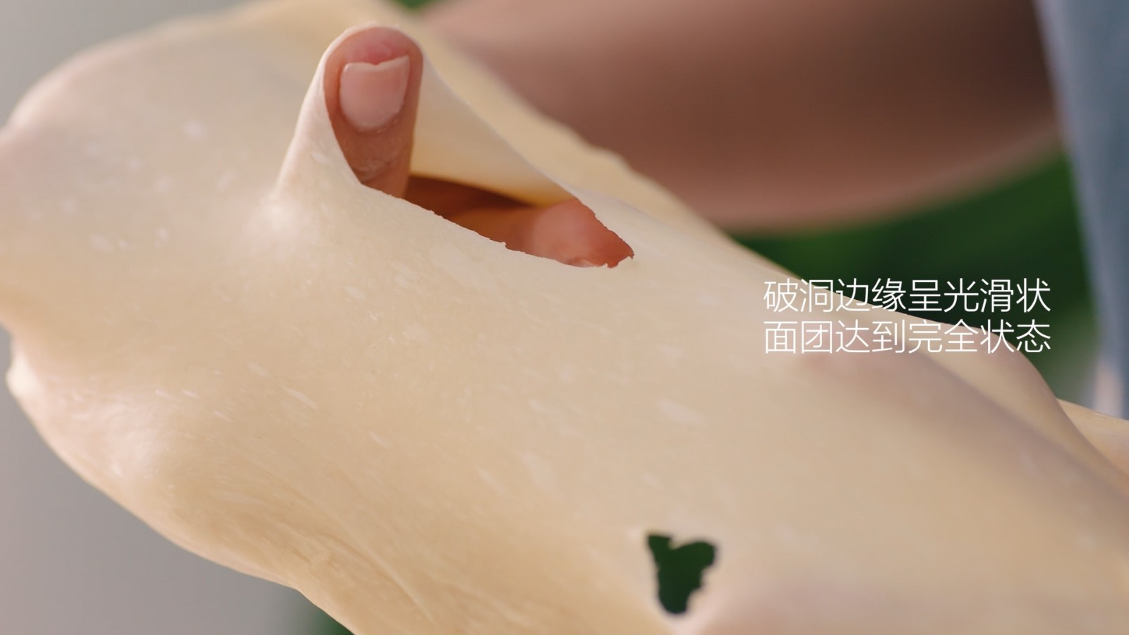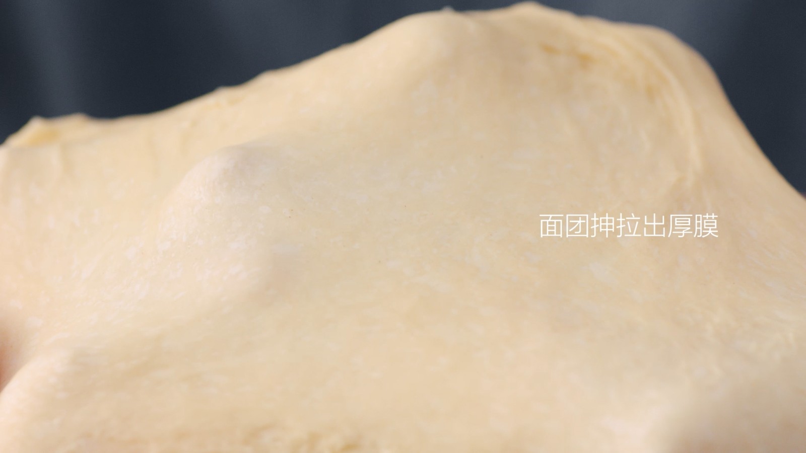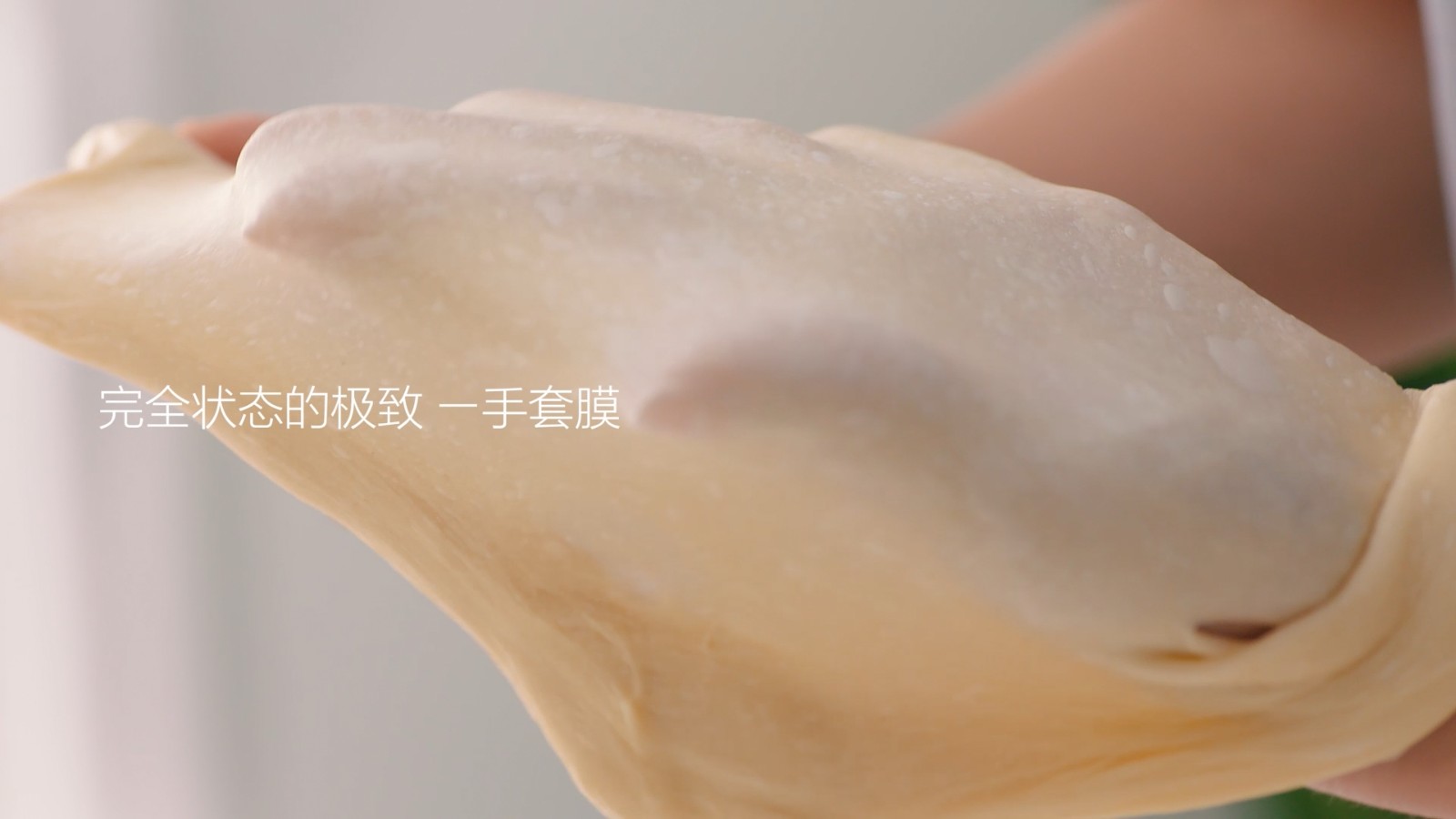 继续中低档搅拌1分钟左右,面团能够抻出一张很大的薄膜,即大家都常说的“手套膜”。手套膜状态的面团会比完全状态的面团拥有更好的延展性,但并不是说揉面就必须出现手套膜哦!