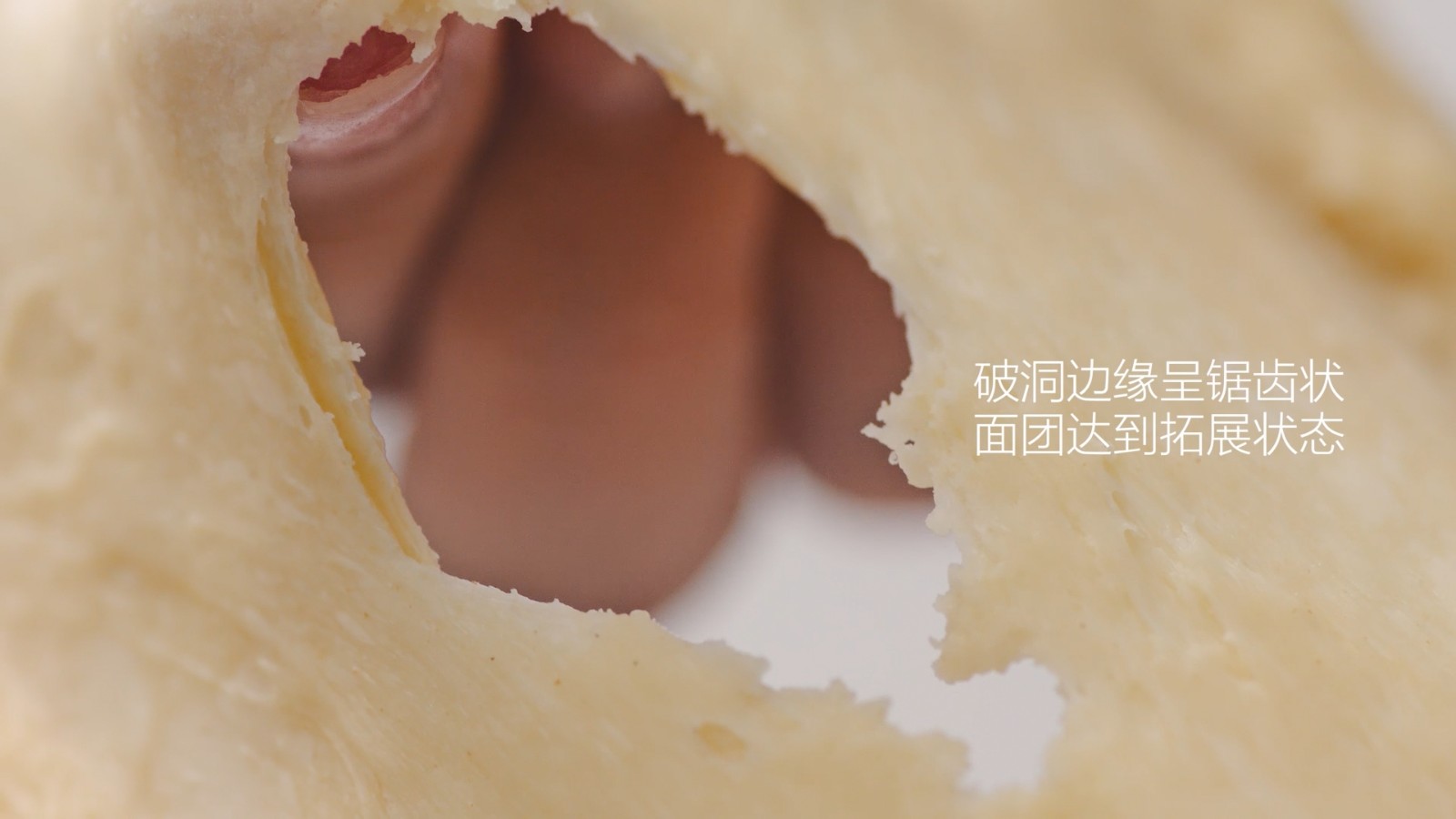 如果面团表面看上去较光,且已经不沾打面钩、不沾盆壁、不粘手(3不沾),即代表状态接近。取鸡蛋大小的一团面,用双手慢慢将面团抻开,会是较厚的一层膜、用手指戳洞会看到边缘有毛刺,这就是烘焙中常说的扩展阶段。