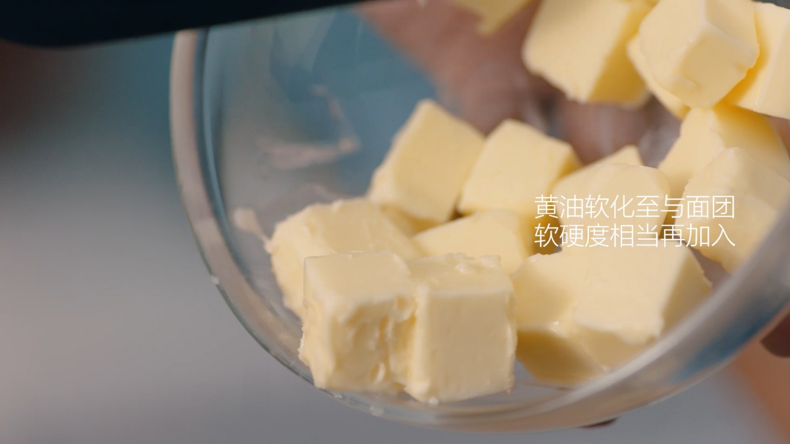 面团达到扩展状态后,将软化好的黄油加入面团中继续搅打,加入黄油的目的,是让已经出膜的面团具有良好的延展性。黄油的软硬度以“跟面团软硬度相当”为最佳。