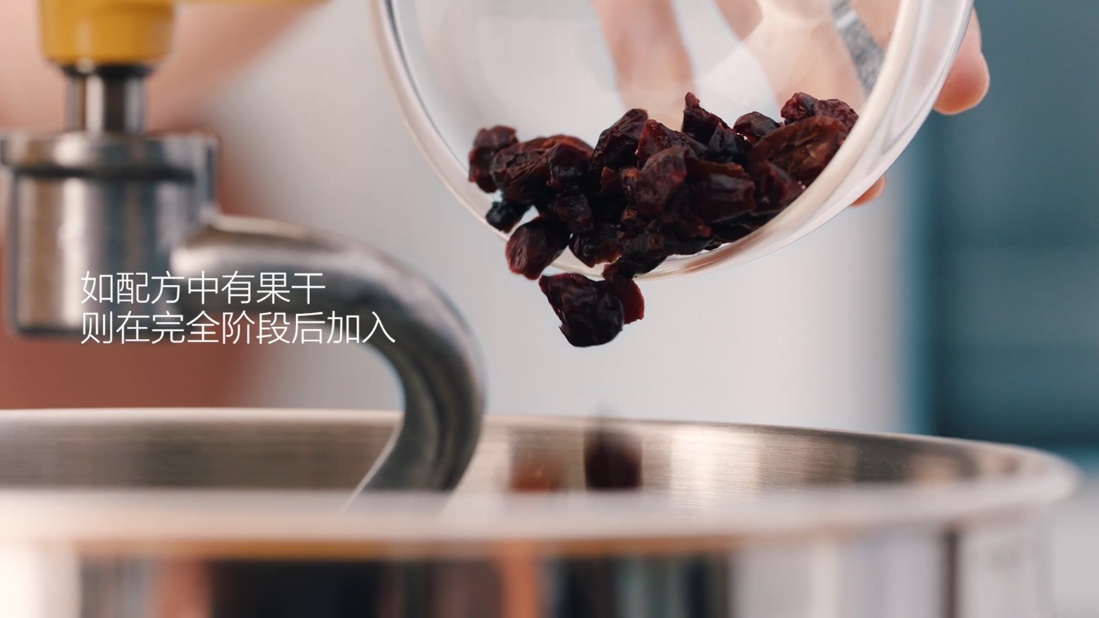 面团达到完全状态后,如果还有果干之类的辅料,则在此时加入,低速揉匀即可。