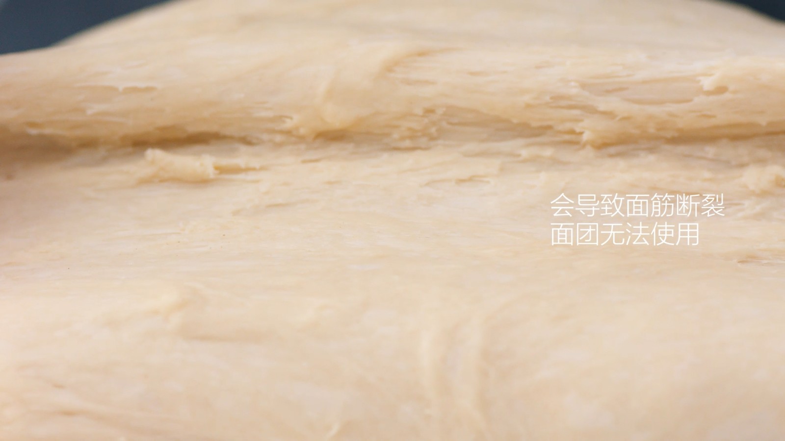 如果达到完全状态后仍然使用中高速、长时间搅拌面团,面团表面可能会变得粗糙,用手抻拉组织,呈现出蜘蛛网的感觉,这个就是“断筋”,即面团中的面筋已经完全断裂,无法再使用。