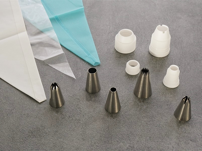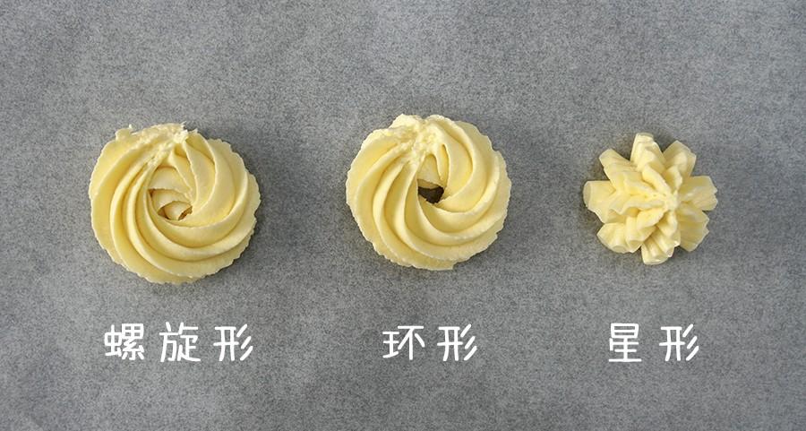曲奇面糊较硬,通常用结实的布或硅胶裱花袋;裱花嘴则通常使用带齿的。