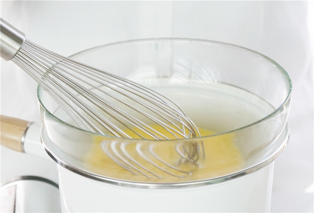 2、 隔水开小火加热,边加热边用手动打蛋器不断搅拌,直至蛋液和砂糖混合均匀,蛋液温度到达40度左右(用针式温度计或红外线温度计探测,没有的话可以手指触碰蛋液,感觉稍高于体温即可)。
