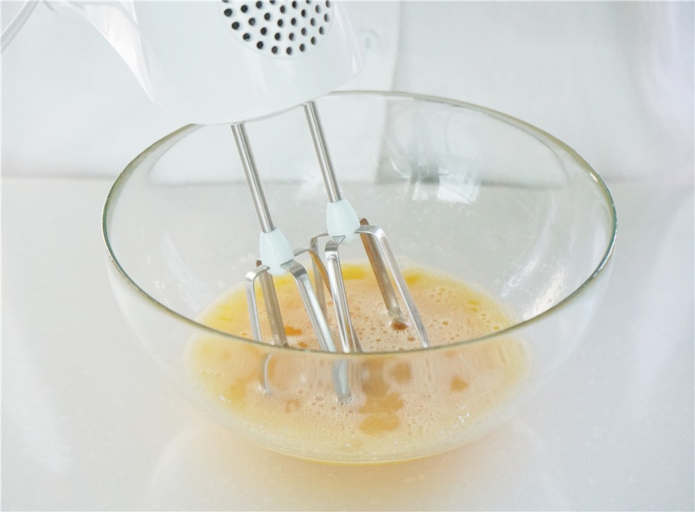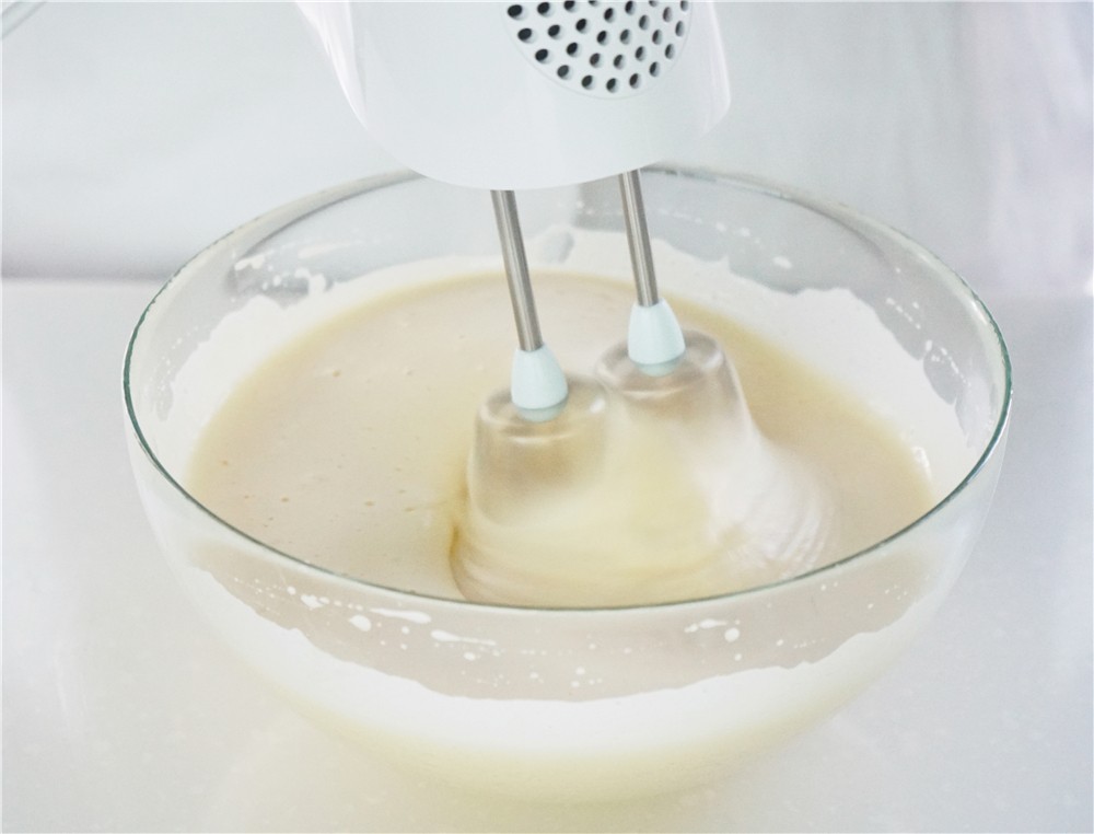 2、继续打发约3、4分钟,此时蛋液气泡很密,质感已经开始变浓稠,颜色也明显变白,