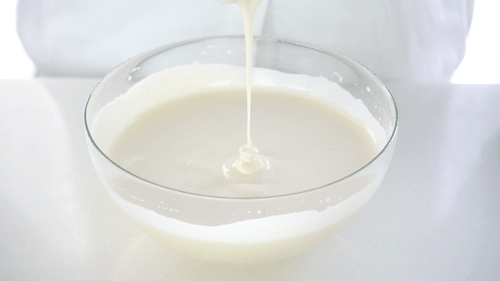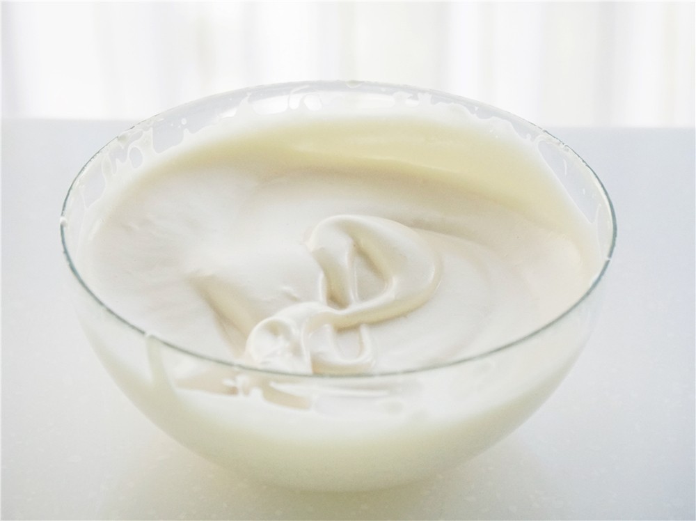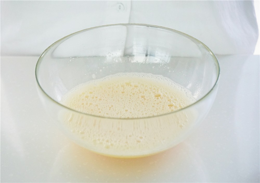 此时蛋液气泡很大,颜色稍微变浅,蛋液体积稍有变大。
