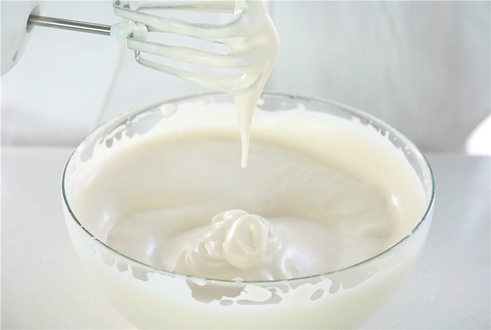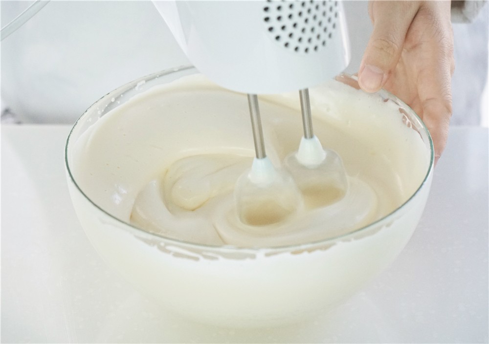 当提起打蛋头后,蛋糊流下的非常缓慢,而且落下的蛋糊也能再表面留下不消失的痕迹时,就说明已经打发好了,但别忘了最后要再用低速搅打约2分钟,整理一下气泡。