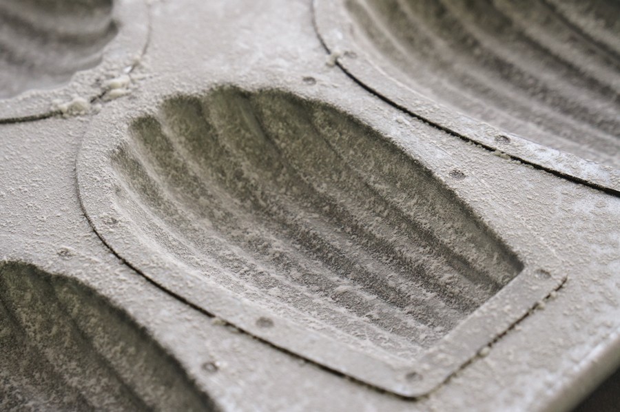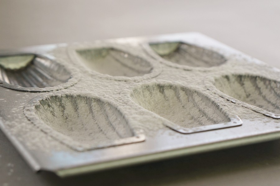 翻转模具磕出多余的干粉,此时的模具内壁均匀粘附很薄的一层面粉。如果对模具防粘要求更高,可以重复一次筛粉动作,保证粘附的干粉层更加均匀完整。之后将制作好的面糊直接装填即可。