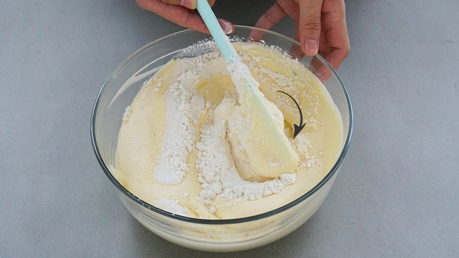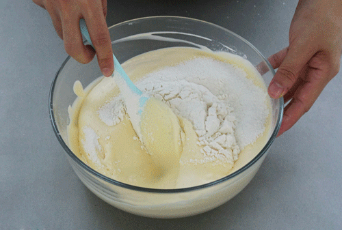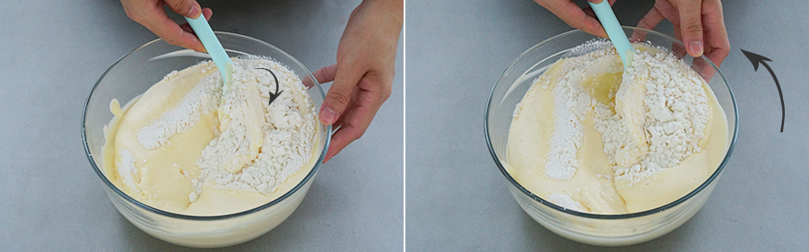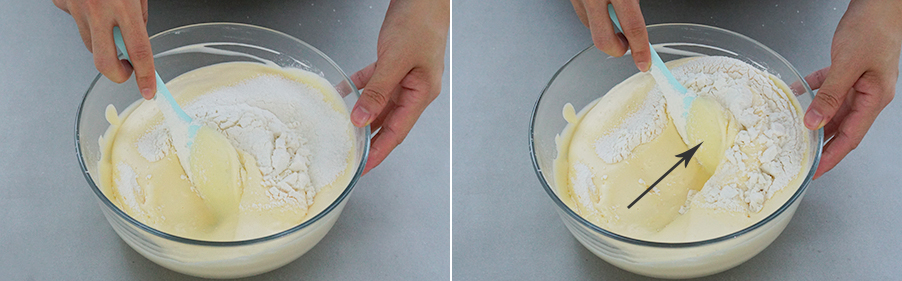 当我们需要将打发蛋白霜、打发全蛋糊与其他粉类、液体材料混合时,通常会用到翻拌的手法,这种手法能在比较不破坏打发泡沫的情况下将材料混匀。