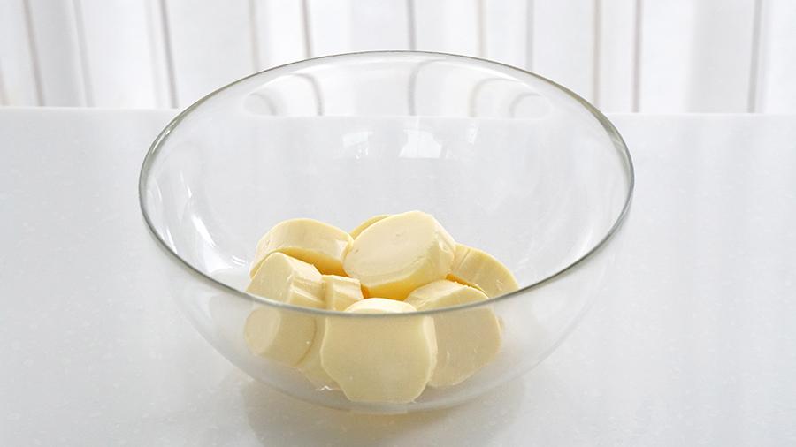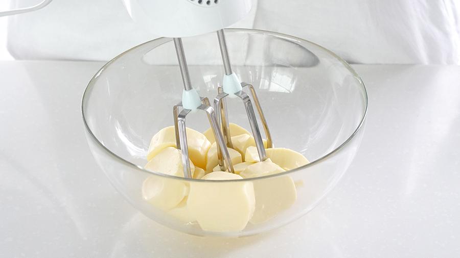 一般黄油是以冷冻的形式长期储存,而用于打发的黄油,需要先切成片状或者小块,放在25度左右的室温中,软化至用手指能够在表面轻松地压出痕迹。南方如果冬天室温较低,可以使用微波炉或隔热水小心加热,让黄油软化。