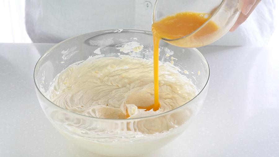 4、将打散的常温鸡蛋液分3~4次加入黄油中打发,每一次加入少量蛋液,用电动打蛋器低速搅打,使黄油和蛋液混合均匀后,再加入下一次。(注意千万千万不能一次性加入所有蛋液!否则会出现水油分离的情况!你的打发就失败啦!)