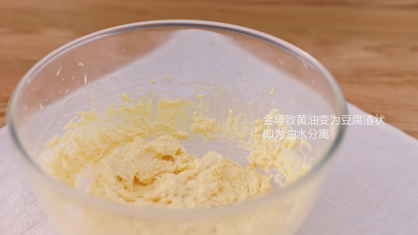 3、 如果一次加鸡蛋液太多,或者使用了冷藏的鸡蛋液,可能会导致黄油霜出现油水分离的情况(黄油霜呈松散颗粒状,析出水状液体)。这种情况下,可以立刻加入一勺面粉并混匀,直至黄油霜回复柔滑的膏状质地。这样的黄油霜仍然可以使用,但蓬松效果可能会比较差。