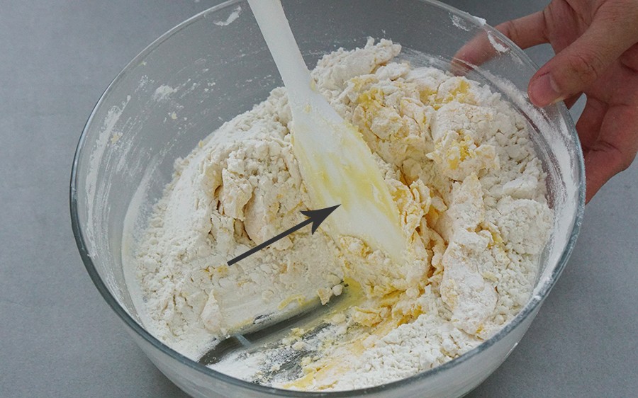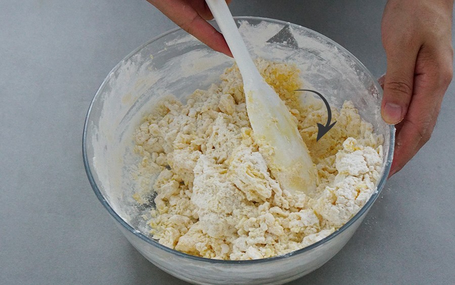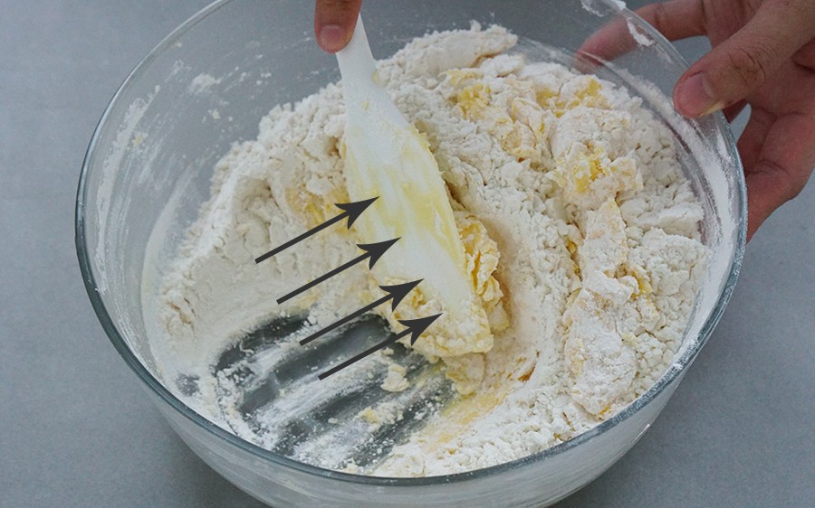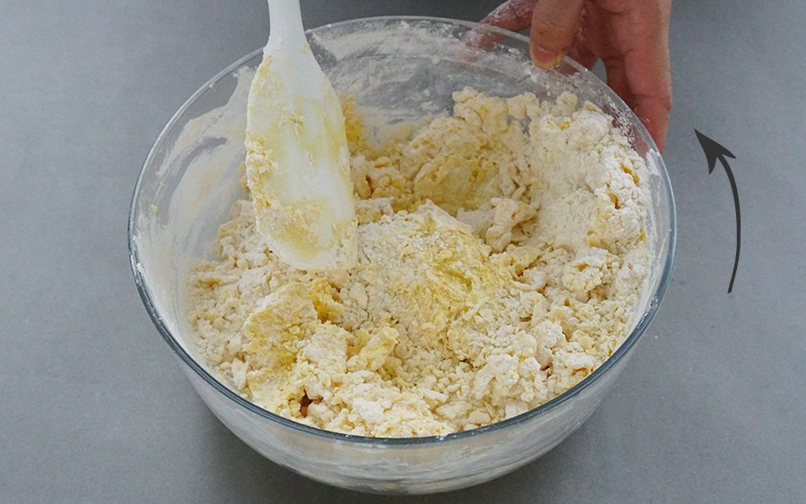 1. 用刮刀把材料从斜上方往下拨,刮刀始终贴着盆底;