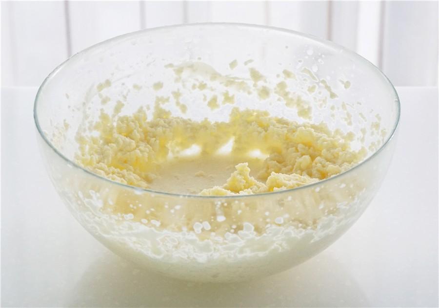 大概十几二十秒钟之后,豆腐渣状的奶油就会分离出黄色的固体(即黄油)和白色的液体(buttermilk,制作黄油的副产品,中文叫酪乳或脱脂奶),当你看不到原本的豆腐渣奶油的时候,就算是分离好了;