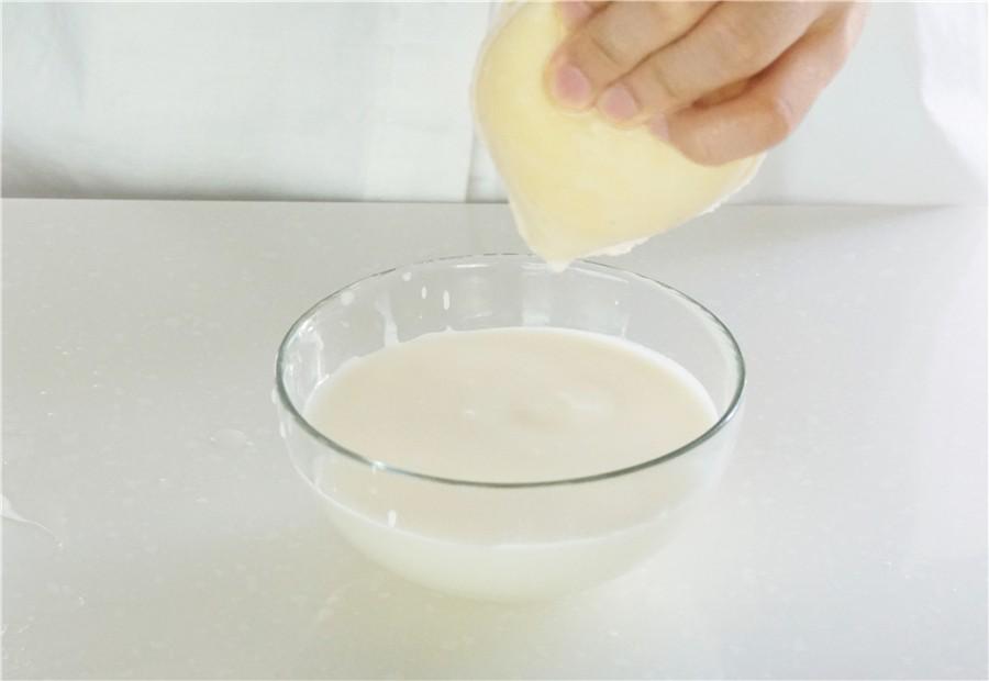 第二步:在一个大碗上套个纱布袋(煲汤袋、中药袋等),将黄油酪乳混合物倒进去,收紧袋口,把剩余的水份挤出,直至没有酪乳滴落;