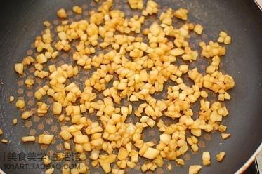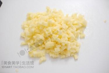 步骤1、苹果切丁,放入碗内。加入柠檬香精和2勺糖。静置5分钟。