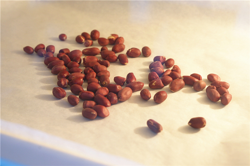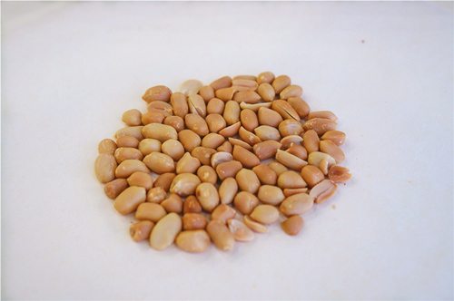 步骤2、烤箱165度预热,去壳干花生平铺在烤盘里,烘烤12-15分钟,至花生稍微爆开。取出晾凉,剥去花生皮,把干净的花生粒紧密的堆在一张新油纸上;
