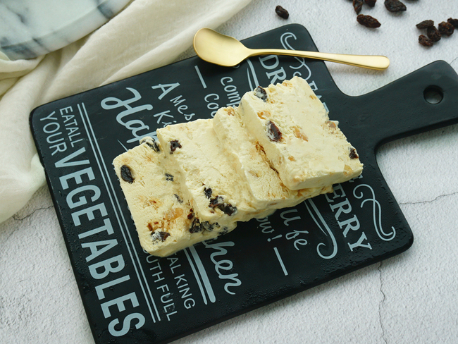 步骤1、磅蛋糕铺油纸;朗姆酒与葡萄干提前一小时混合浸泡,朗姆酒要完全没过葡萄干;