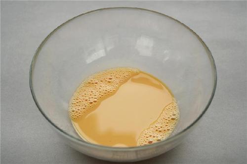步骤1、 分蛋:蛋黄放至常温,蛋白入冰箱冷冻室;因为原料中使用了巧克力,所以配方中的食材除蛋白外都需要放至常温状态使用; 接着把牛奶加入蛋黄中,搅拌均匀;