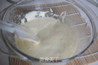 步骤9、从筛入面包粉的盆中盛出少许面包粉蛋液,放入油和牛奶中搅拌均匀