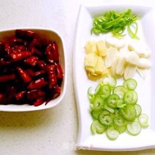 步骤9、葱姜蒜切片,留一小部分葱切丝,干辣椒切段。