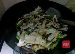 步骤5、随后加入青椒和蒜片和花椒煸香,在把切好的姬松茸放入锅里一起煸炒