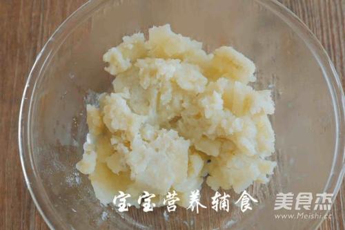 步骤6、6. 然后用勺子将红薯捣成泥。 PS: 红薯蒸好后,要趁热捣成泥噢,否则凉了就不好再弄了。