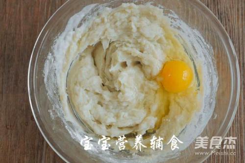 步骤10、10. 再打入一个鸡蛋,继续搅拌均匀。 PS: 加入鸡蛋是为了让成品的口感更丰富,是为了如果宝宝对鸡蛋过敏,这一步就可以省略了。