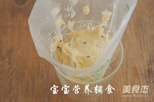 步骤14、15. 再用小勺将红薯泥放入裱花袋中。 PS: 可以将裱花袋放在杯子里,这样更方便固定噢!