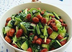 步骤4、将黄瓜、香菜加,入花生中,加盐、生抽、陈醋、细砂糖、香油拌匀即可(最好要吃的时侯再拌。否则被酱汁泡久了就不脆了)