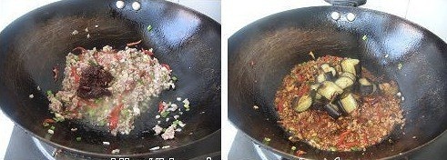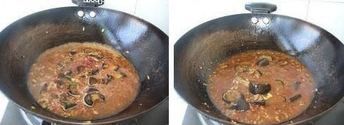 步骤4、再加入豆瓣酱翻炒至香,加料酒、白糖和炸好的茄子