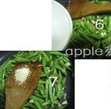 步骤5、扁豆断生,倒入雪菜,翻炒