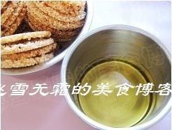 步骤12、然后将模具放入油锅里。如果油量比较少,可以用勺子将热油倒入模具中。会自动帮你炸好拉