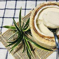 步骤8、 倒入椰子壳内。如果不满可以再加适量椰汁,搅拌均匀。封上保鲜膜,冰箱冷藏4小时以上。