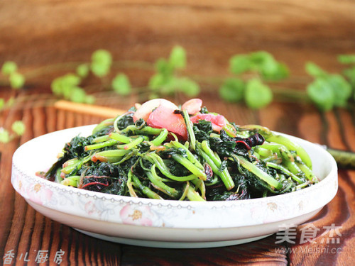 步骤5、再把红米苋倒入煸炒至变色出水加入盐调味