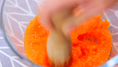步骤4、胡萝卜完全熟透后取出,捣成泥状。 *这里的胡萝卜泥要尽量捣细腻,必要的话可以过筛一次。