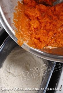 步骤1、将干性材料倒入搅拌机中加入红萝卜泥搅拌