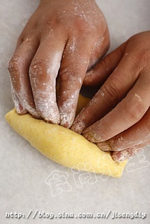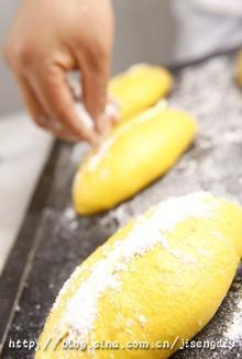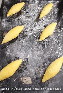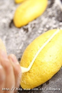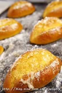 步骤9、发酵至原体积的2倍大,表面刷蛋液,在中间划刀口,挤上黄油