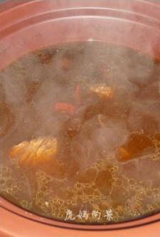 步骤5、大约2-3个小时后,当能闻到满屋飘着牛肉的香味时,就要随时的观察,若用一根筷子能轻松的穿过牛肉即可关火。然后不着急吃的牛肉不要取出,继续泡在汤汁里面,过夜上色会更好看也更入味