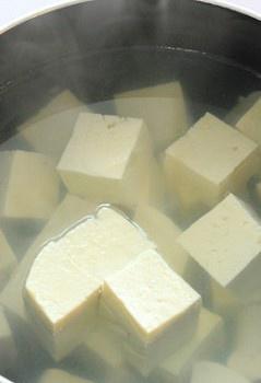 步骤2、用80度左右的热水加盐浸泡十分钟去除豆腥味