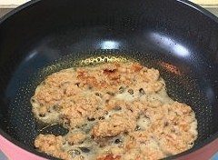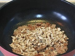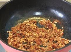 步骤9、再起锅放油,把腌制过的肉末下锅划散翻炒颜色变白