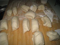 步骤3、把发好的面团倒入,摊在案板上放约15分钟,然后再搓成光滑的面团;把面团搓成长条,然后用工具切成大小相等的份