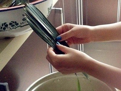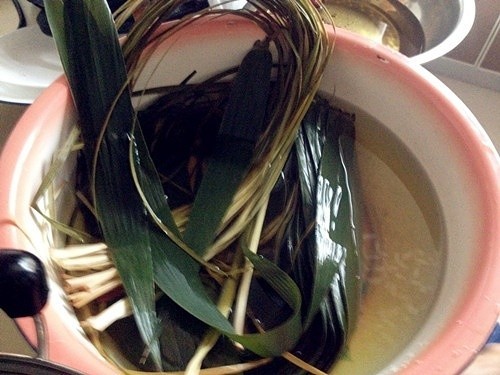 步骤2、苇叶和马莲喜好泡几个小时泡软。马莲是细的这种,用来捆粽子,纯植物哟,谁要用线绳呀,嘁。
