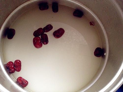 步骤3、洗好的糯米和红枣泡在水里。