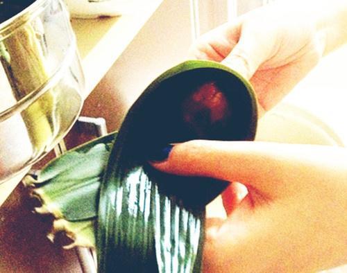 步骤5、将苇叶窝成一个三角筒,底部加一个大枣。