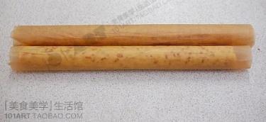 步骤6、将面团分成两份。用烘焙纸卷成圆柱,放入冰箱内冷冻一小时。取出,切成块状。