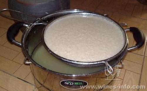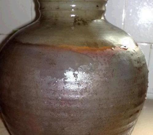 步骤3、发酵。拌曲后一天左右(寒冷天气要2天),酒饭已进入糖化高峰,将酒饭倒入发酵罐,我用的是本地土制的瓦罐,土得不能再土了,盖子用的是瓷碗包纱布,但很便宜,几块钱一个(7.5升),还有15升和25升的。