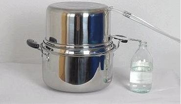 步骤6、放入专门的微型蒸馏器(它的学名叫微型酿酒器)中,进行蒸馏。加热设备是电磁炉,蒸馏时先用大火烧开,沸腾后改用中火,很快酒就源源不断蒸出来了。
