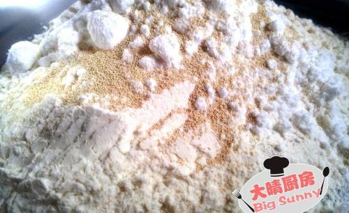 步骤1、将高筋面粉、糖粉(20g)、酵母、盐混合,加入水,揉搓成面团。